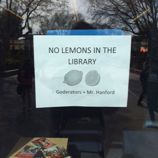 Now, to end with a short and sweet (or sour) tale. We didn't get a photo for this one, so instead here's a photo of the sign we put up on the library. How cute. Speaking of cute, Melvin was walking out of his fifth period class when his killer's friend ran up to his ear and screamed into it. Scared and surprised, he put his hand to his mouth and... Rest in peace, friend.