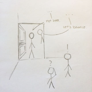 At the corner of the school, we saw our person. He/she dipped into the computer lab, and we were about to follow him/her in... But we stopped at the door, came up with our cornering strategy, and went in one by one to not arouse suspicion. When we were all inside, we couldn't find him/her. It was like he/she vanished... Just kidding, he/she was studying something on a computer in the corner. We literally cornered him/her, stood there for a second, before launching the accusations. Awkwardness ensued.