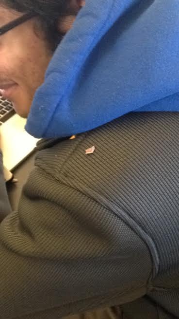 Oh right, kill story for today. Nothing too over the top. During seventh period, Rahul was sitting at his laptop in the middle of the library without his spoon for some reason. His killer made some not-so-subtle circles around him before tagging him out. Not sure if he gave up or if he's just really, really bad at Spoons. Either way, here's a picture of his shoulder.