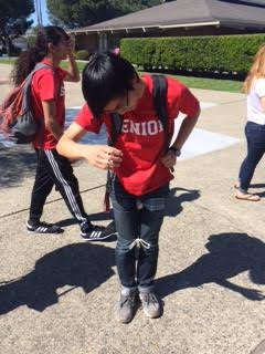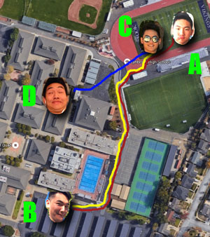 Well, Alvin got a good amount of cardio today, that's for sure. Above, we've drawn a diagram of Alvin's routes at labeled specific points on his journey towards death (“D” for death), and we'll go through the whole course. After the senior panoramic today (Point A), Alvin stayed behind on the field to be part of a yearbook photograph. Unfortunately, it took longer than planned, and ended up going into lunch. His soccer ball was on the side of the field, where Will and Shivani were kicking it back and forth. When Alvin saw his killer approach, he ran towards Will and Shivani and yelled for his ball, but they kind of just looked at him with blank stares. His killer tagged him, he felt sad, he exchanged cards, and he walked out to the parking lot.